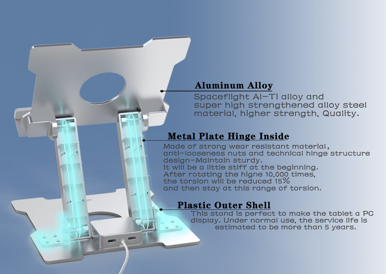 【OUR TABLET STAND】 Made of spaceflight Al-Ti alloy and super high strengthened aluminium alloy steel material, higher strength, lighter weight.Aluminum metal martial will cool your devices better. The Hole in the platform station increases airflow.
