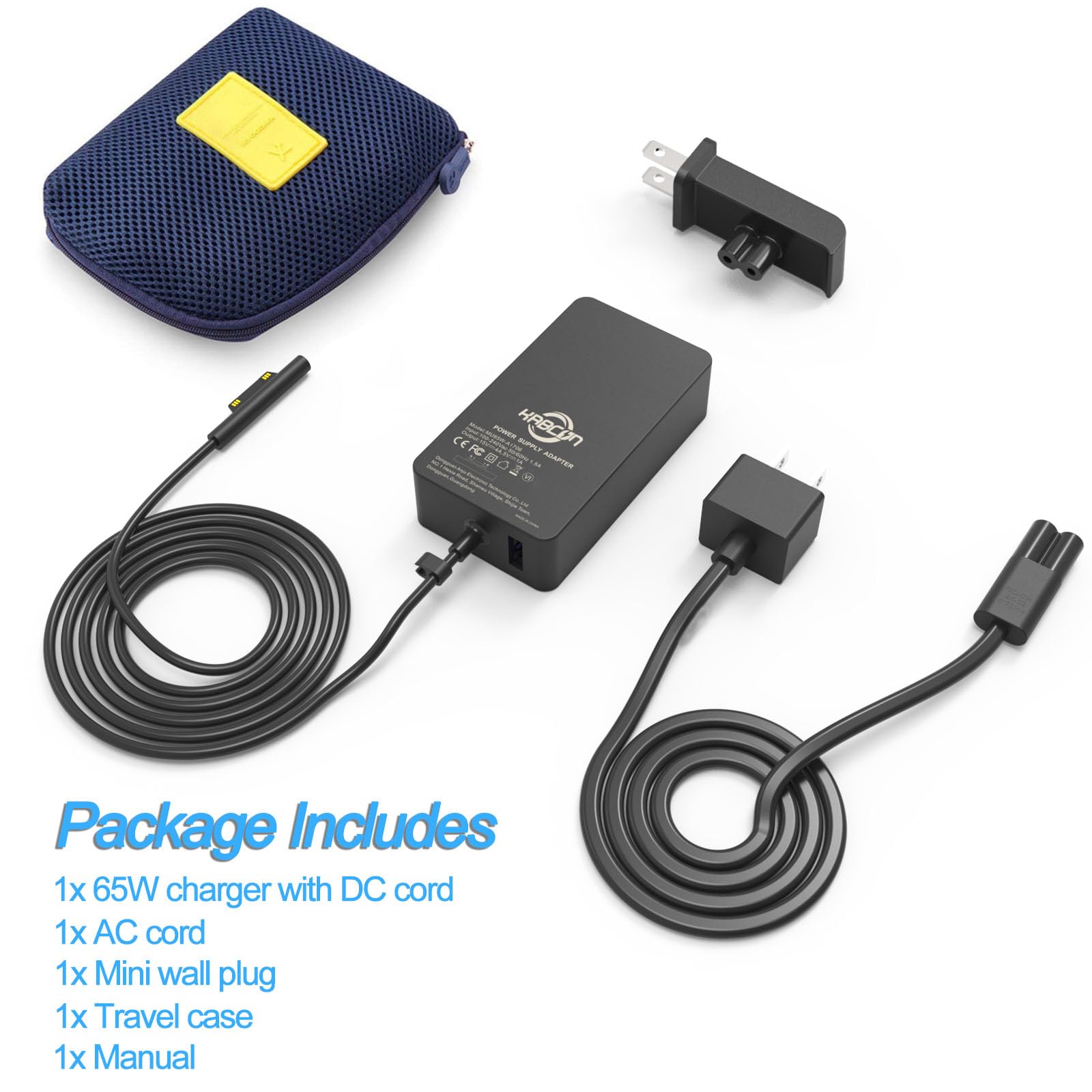 - Package includes: 1x KABCON 65W Power Supply, 1x the Extra-long Power Cord 6.2Ft, 1x Wall Plug, 1x Travel Case, 1x Manual. About warranty: 1 Year Warranty with Replacement Coverage.